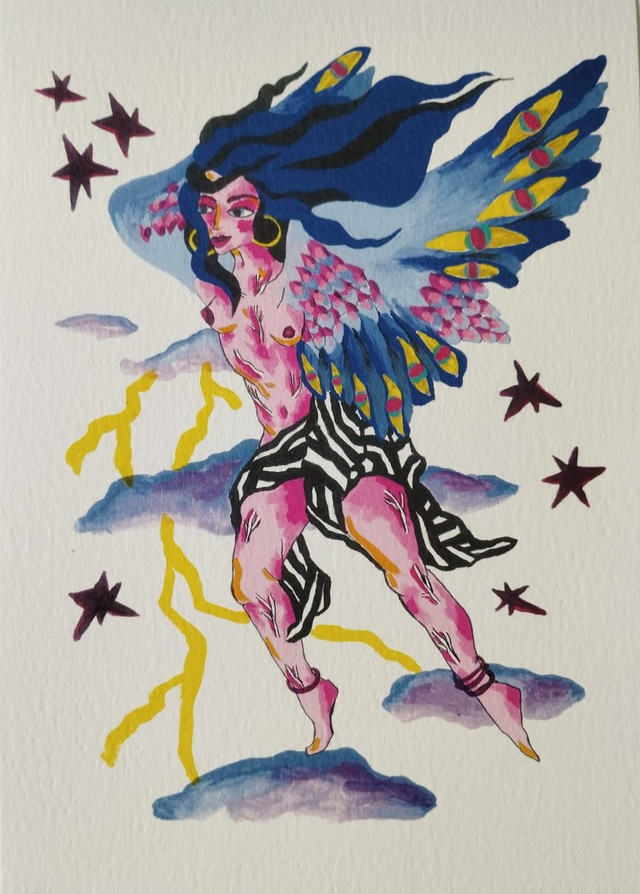 Les croyances et les symbolismes qui leurs sont associés, les récits collectifs ainsi que leur résonance avec le réel et les enjeux du monde d’aujourd’hui la fascine et elle les retranscris, à sa manière dans son univers très coloré.